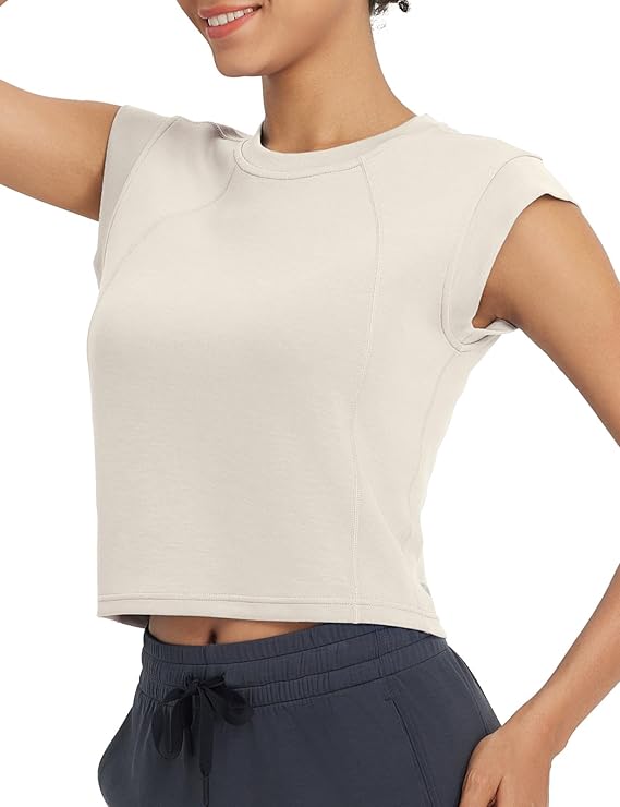 - Crop Length: These yoga tops is 19″ inseam. Loose hem is neither long nor short, and can cover the abdomen well from the front. The high-ish neckline let you don’t feel too exposed while wearing a tank at workout.