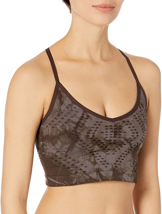 This bra has solid seamless 1×1 rib with wicking at its body, it has 1×3 seamless wide raised rib with wicking at its sides and it has a folded edge striped 1×1 rib waistband with wicking. There are 3 rows of 2mm raised contrast stipes. The neckline is a mitered v-neck.