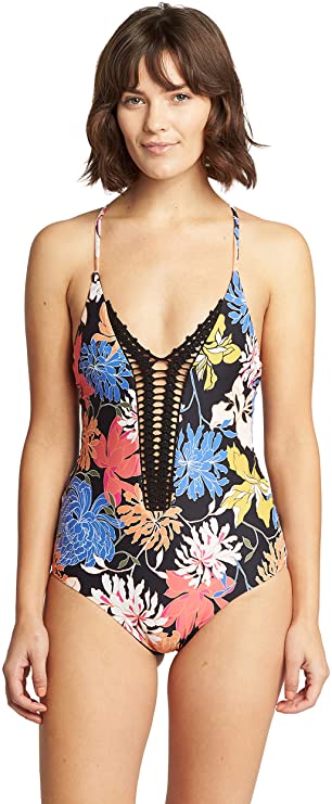 Classic one piece swimsuit with crochet detail at center front and crisscross adjustable straps.