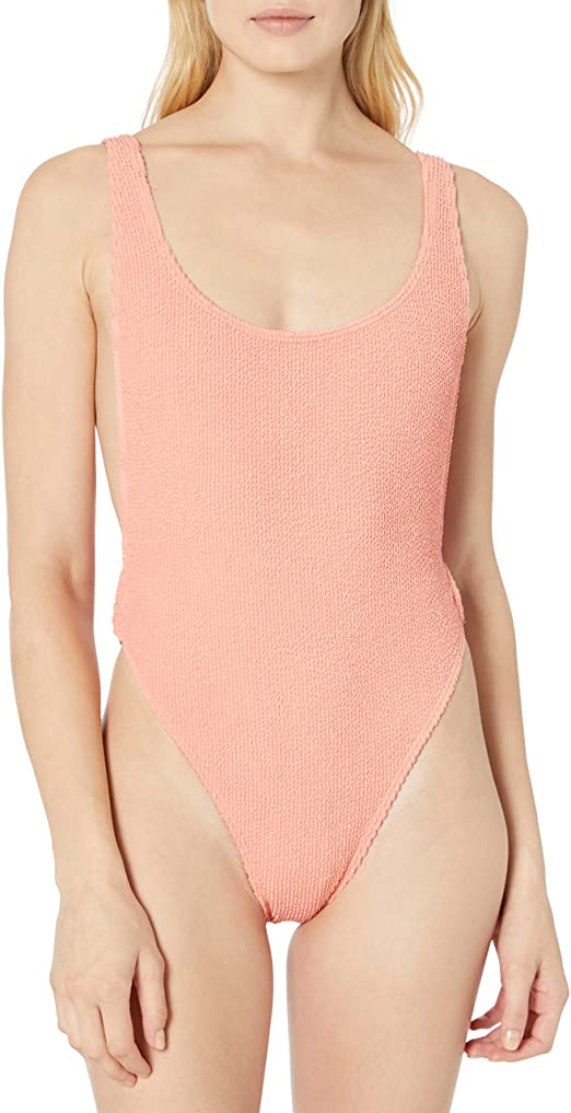 Summer high textured one piece with scoop front detail at front and back, high leg with tortoise shell rings at side seams and hike pant coverage.