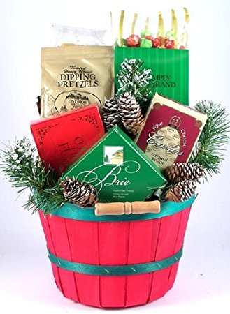 This wonderful gift features a peck red and green bushel basket filled with creamy Double Truffle Cocoa, Chocolate Fudge, Yogurt covered Pretzels, Cranberry Pecan Cookies Bottomed in Dark Chocolate, Crackers, Vegetable Cheese Spread, Swiss Cheese, Fruit Jelly Preserves, Honey Mustard Pretzel Twists and a Cranberry Almond Snack Mix!