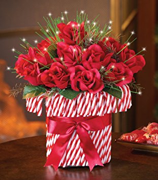 This sweet holiday centerpiece features a festive and colorful design. Red and white candy canes wrapped with a bright red bow are filled with beautiful red roses highlighted with fiber-optic lights. Includes 3 button cell batteries. Polyester and plastic. 9″Dia. x 10″H.