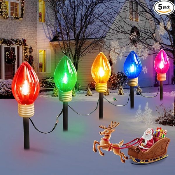 - Christmas Pathway Lights Outdoor: Jumbo C9 bulbs covered Christmas string lights, external jumbo C9 bulb size: 7.4 x 3.8 inches, internal lighted bulb size: 0.9 x 2.1 inches, and each bulb is 24 inches apart, 10.8 inches pathway markers, E12 socket compatible, outdoor indoor use. Come with 5 hooks, you also can hang these charming holiday lights on roof, window, fence, etc. Outdoor christmas lights will light up your pathway, garden, yard, house when they are on