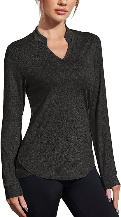 - Design Features: Long sleeves, v neck, side slits hem, shrink cuffs, color block/solid. They are designed specifically for working out in, and they also make great everyday shirts.