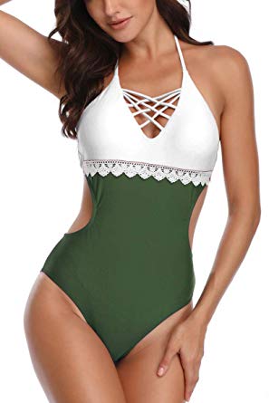 This one piece swimsuit features self-tie halter neckline,crisscross detail,crochet trim, high waist and open back.