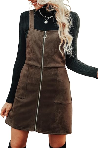 - [Unique Design]: Faux Suede Pull-Ring Pinafore Dress. This chic and stylish piece combines comfort and trendiness, making it a must-have addition to your wardrobe for a look that’s both elegant and playful.Looks best especially match it with a long sleeve tops or blouse in black or white.
