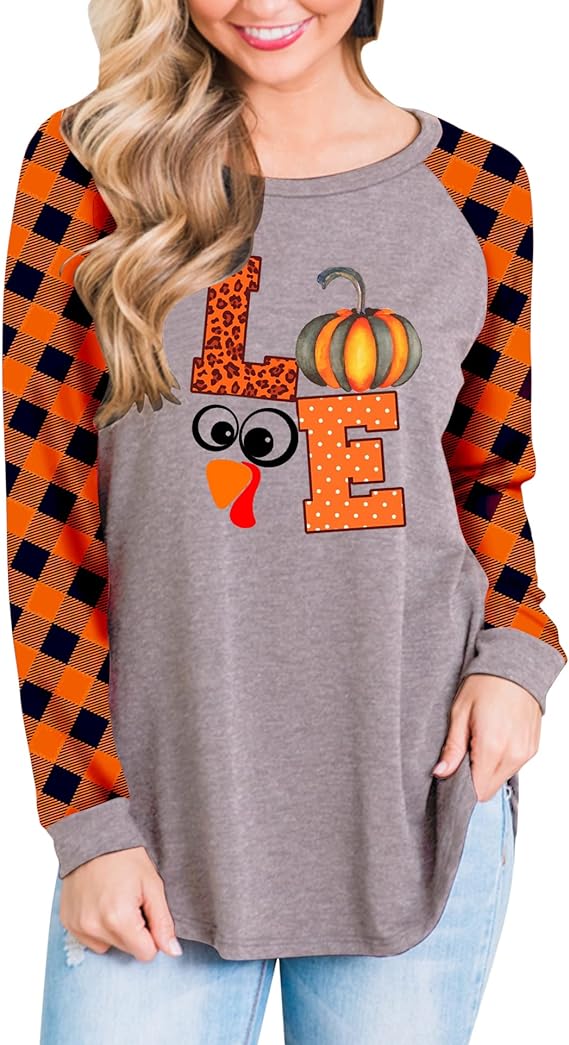 Deerose Womens Thanksgiving Shirt Long Plaid Sleeve Funny Printed Turkey Tops