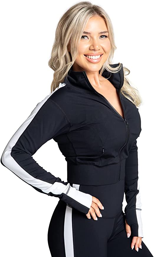 DELFIN BRANDS designs innovative fitness apparel. Ladies sports workout jacket best for low to high impact exercise, yoga and everyday activities. FEATURES: Double-lined high collar, durable full YKK zip front, front zippered pockets to hold your essentials, thumbholes help keep sleeves in place, 3″ band at waist for hourglass body contouring, contrasting stripes at sleeves, Delfin logo at back. COMFORT: Flat seams for comfort and durability, tag-free care label. FABRIC DETAILS: Ultra buttery soft, smooth, lightweight, 4-way stretch, quick-drying, breathable.