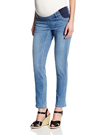 Skinny fit maternity jean featuring elastic-goring insets at waistband and whiskering at hips