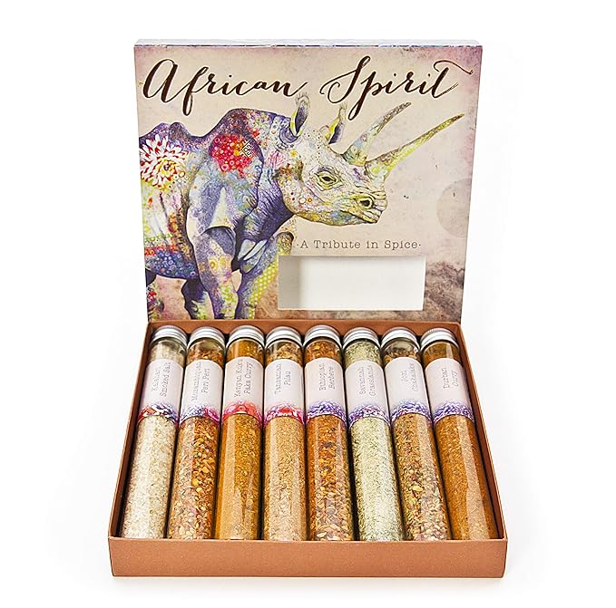 - 100% ALL-NATURAL FLAVORS – Durban Curry, Jozi Chakalaka, Savannah Grasslands, Ethiopian Berbere, Tanzanian Pilau, Kenyan Kuku Paka Curry, Mozambican Peri Peri & Kalahari Smoked Salt. This set includes 8 unique spices and seasonings sourced from around the world, stored in individual glass tubes.