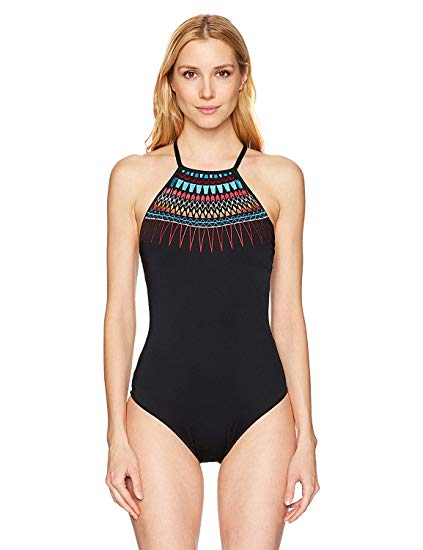 Going on a beach getaway this high neck one piece swimsuit needs to be on your packing list! this embroidered high neck one piece swimsuit has a traditional high neck design, a gorgeous multicolored embroidery along the chest, adjustable straps, and removable cups to give you comfort and support.