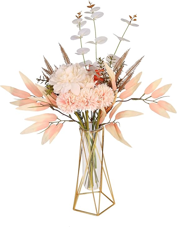 - 【Fake Flowers with Vase】- Silk flower contains artificial bouquet, 1 golden vase (iron frame + glass bottle), beautifully packaged in a gift box. 12 real touch flowers are made of high quality silk. It is non-toxic and UV resistant. Artificial flowers and vase together: about 19.6″ (H) * 17.7″ (W). Vase. 9″(H)*4.5″(W).