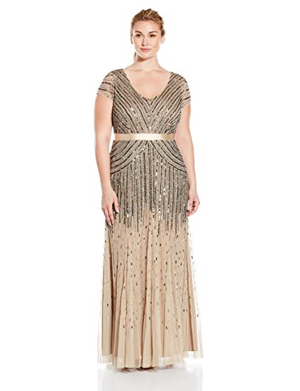 Adrianna Papell Women’s Plus Size Floor Length Beaded Cap Sleeve V-Neck Dress