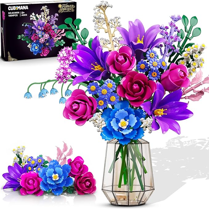 - 【VIVID AND DIVERSE BLOOMS】CUBIMANA Flower Bouquet Building Set includes 21 different flowers, such as Rose, Lilies, Daisies, Hydrangeas, Eucalyptus, Gypsophila, Lily of the Valley, Peony, Campanula, and Starry Cosmos, etc. Each flower in this flower botanical collection kit brings the beauty of nature into your home. The bouquet building blocks snap together easily to create stunning artificial flower set arrangements that never wilt (NOTE: Vase not included)