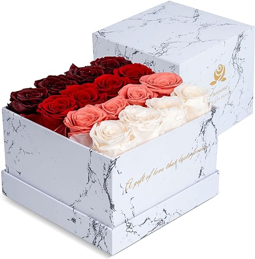 - DISCOVER THE MAGIC OF 16 ETERNAL REAL RED ROSES BOX: These are not ordinary roses, but natural red flowers that have been preserved to last for more than a year. They come in a gorgeous white marble box that will make any space look more luxurious and elegant. These roses are the ultimate gift for any occasion, as they show your eternal love and gratitude.