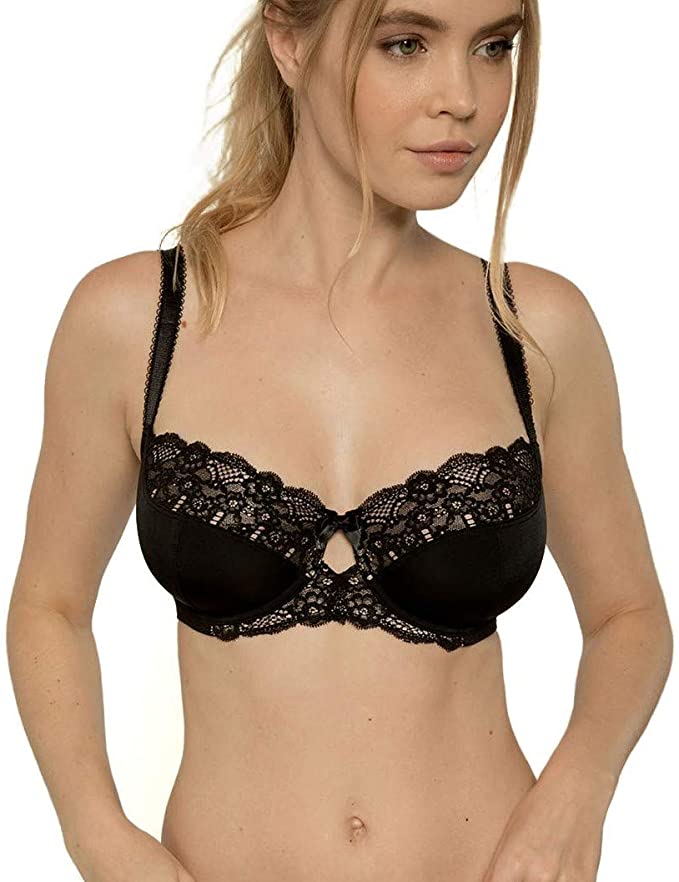 Designed for fuller figures, this beautifully styled black bra in smooth micro features luxurious scalloped lace across the top of the cups, picot trimmed straps and a keyhole feature.