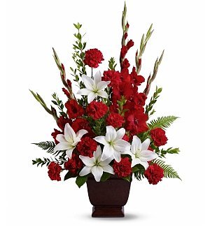 Vivid and touching, rich reds and serene white flowers blend in honor of a life filled with love, light, and grace. This stunning sympathy bouquet features fresh flowers such as gladioli, carnations, white Asiatic lilies, myrtle, sword fern, and salal in an classic urn-style vase. WIth red for passion and white for purity, the bouquet is a beautiful expression of your heart’s sentiments. Measures 24″ x 34.” To ensure the best arrangement, flower varieties and container may vary.