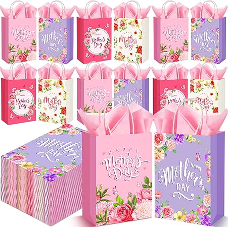 - Creative Designs: Offering four elegant floral designs and featuring the heartfelt words ‘Happy Mother’s Day, ‘ this set adds an elegant touch to every gift. Display your sincerest thanks and blessings in a stylish manner; We provide you with 4 different gift bags, using elegant floral patterns, with different background colors such as purple, pink, beige design, we also match you with pink tissue paper, so that you can put the gift, hide the gift, create a surprise