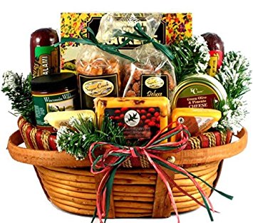 Our Best Selling holiday basket is impressive to say the least, and includes a deluxe cutting board. We have filled this very handsome and unique wooden basket with: Gourmet Focaccia Crisp Crackers Cranberry Cheddar gourmet Cheese Wisconsin Swiss Cheese Wisconsin Cheddar Cheese A jar of delicious Green Olive and Pimento Cheese Dip Jumbo Cashews and Peanuts “Nik Naks” Cocktail Mix Assorted Dipping Mustard Beef Salami All Beef Summer Sausage with Cranberries (delicious!) Mint Chocolate Wafer Cookies Cranberry Bog Frogs (Sweetened Dried Cranberries and Cashews smothered w/ Caramel and Chocolate)