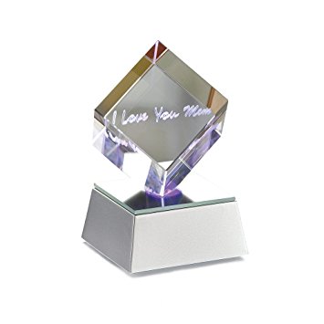 An LED base lights up this clear acrylic cube to set the words “I Love You Mom” aglow at its center. Uses 3 AAA batteries (not included). 2-1/2-inch square by 4-inch high.