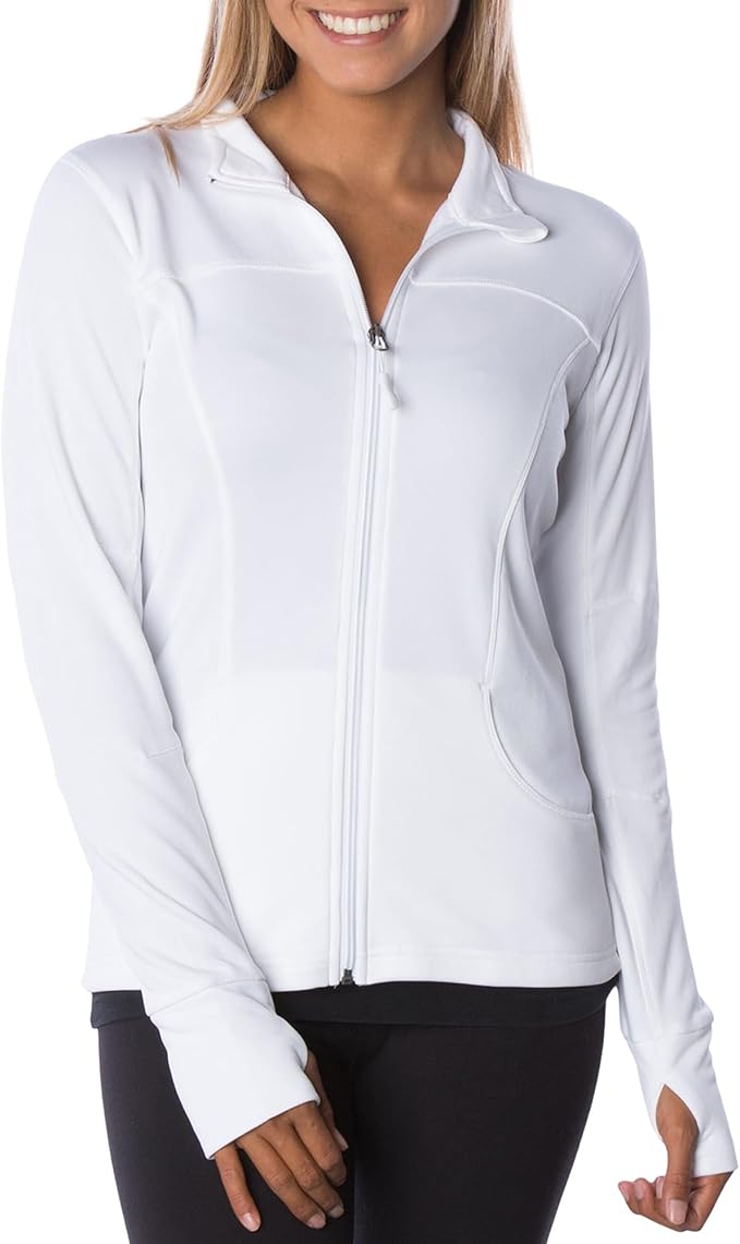 - Athletic Zip-Up Jacket: Our workout jackets for women, available in black and white, features 2 front side pockets, zippered stash pocket and thumbholes. Womens lightweight jackets are perfect for running, yoga, workout or casual. It will be your everyday jacket.