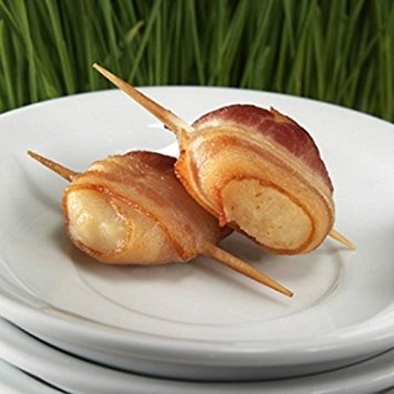 Crispy waterchestnuts wrapped in lean bacon on a toothpick skewer. Gluten-free. ****** Our $49.95 shipping price is for single-tray and some one-tray orders. As you order more trays from our full selection of gourmet appetizers and desserts, your shipping price goes down. See our shipping rates and policies for more details.