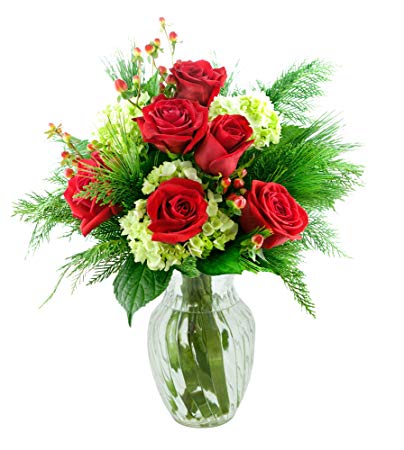 Spread traditional holiday cheer with this seasonal flower arrangement full of classic red roses, pillowy green hydrangeas, cheerful red berries perfectly accented by lush pine greens. These fresh flowers are great for Christmas, the New Year, Thanksgiving, Hanukkah, and the entire Holiday season!