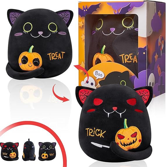 - 【Innovative Double-Sided Design】: Our Halloween Cute Black Cat Plush Doll features a unique double-sided design ,One side showcases an adorable “Treat”face with big, embroidered green eyes,a cheerful smile, and a cute pumpkin with a happy expression. Flip it over to reveal the“Trick”face, complete with sinister red eyes, a mischievous grin showing sharp fangs, and an evil-looking pumpkin. The cat’s ears also have different patterns: one side with playful spider webs and the other with eerie red details,Perfect for adding a touch of spooky charm to your home, office, or party decorations!