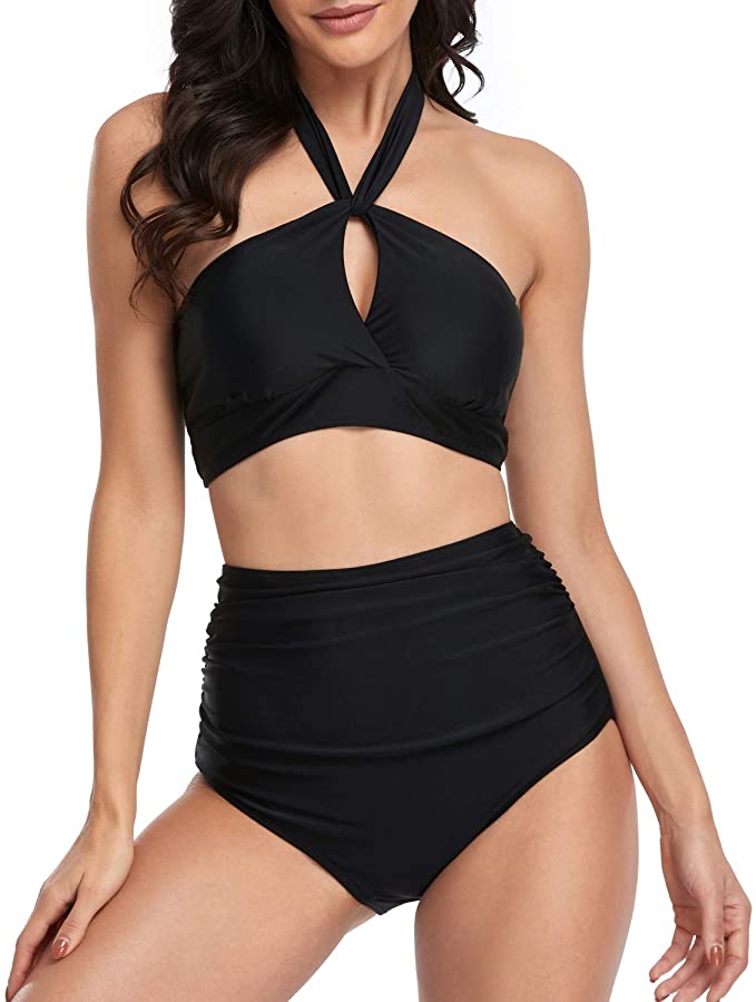 Smismivo High Waisted High Neck Bikini Women’s Two Piece Vintage Swimsuits Halter Black Swimwear Slimming Ruched Bathing Suit