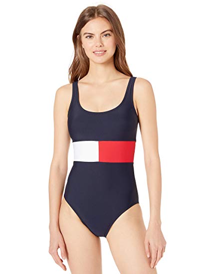 Solid flag logo over the shoulder one piece with scoop neckline