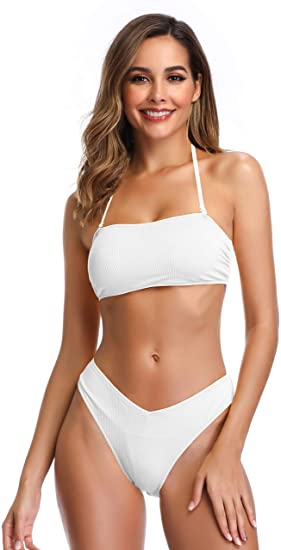SHEKINI Women’s Bathing Suit Lace up Bandeau Bikini Ribbed Two Piece Swimsuit