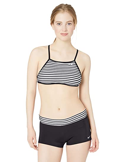 NIKE Swim women’s Nike laser stripe high neck bikini top set offers a great mix of casual style with a striped design and winning performance features. The top features a high neckline with adjustable straps and removable soft cups for a great fit. A modest swim short bottom has a striped elastic waistband for a comfortable, customized fit. Both pieces are made with durable chlorine-resistant fabric.