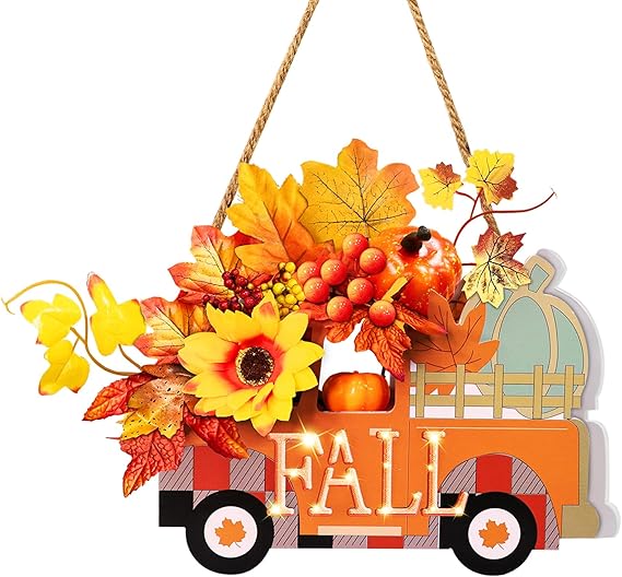 - Fall Truck Wreath Sign with Lights: Package includes a lighted fall truck sign, sized 16 inch by 10.5 by 2.5 inch. The fall wreath sign is adorned with sunflower, maples leafed, pumpkins and berried, making it suitable for decorating various occasions