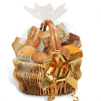 Our lovely keepsake wicker basket is filled with six all natural and all delicious low carb fat free muffins, four assorted low carb fat free coffee cakes, one low carb fat free peanut butter brownie and one low carb fat free double fudge brownie. These goodies are baked with the finest all natural ingredients and no artificial flavors. They won’t believe the truly moist and rich flavor! This gift includes a large gold bow and free complimentary gift card.