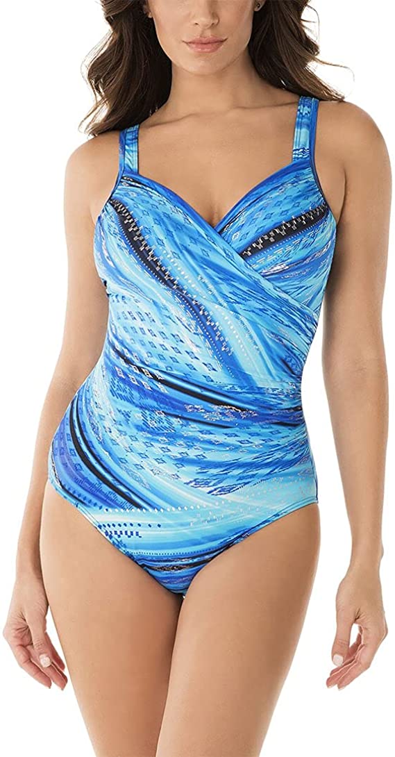 Seraphina surplice one piece swimsuit features underwire support, cleverly draped fabric to conceal tummy and adjustable straps.