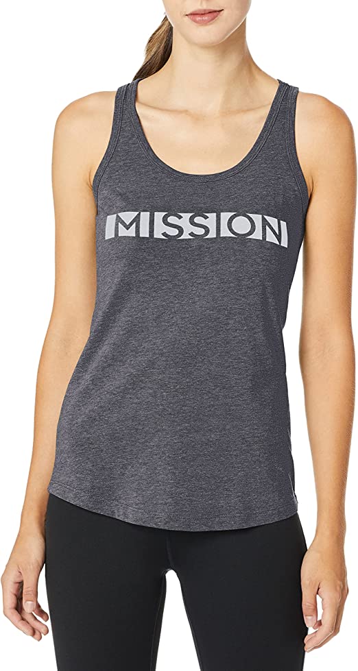 On-trend racerback silhouette with a modern fit and soft, luxurious feel. Naturally slimming look. Premium combed cotton and polyester yarns wick perspiration away from the body. Perfect for working out, or a walk in the park. Screen printed MISSION boxed graphic.