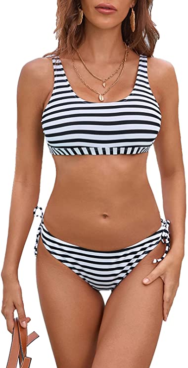 Two-piece swimsuit with black and white stripes, low round neck, low waist, adjustable shoulder strap, detachable cushion, backless and bandage. Your first choice for traveling.