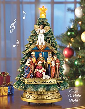 This beautiful Christmas tree features a Nativity scene with Joseph, Mary and Baby Jesus surrounded by the Three Kings, and angel and a shepherd. The manger and star on top light up, and it plays “Silent Night”. Req. 2 “AA” batteries (sold separately). Resin and plastic. 6″Dia. x 10 1/2″H.