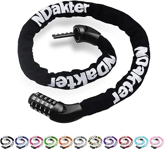 - MULTI-PURPOSE: The chain lock is 3.2 feet, long enough to lock 2-3 bikes together, or lock your bike to a tree, gate, fence, railing, thick pole and others. The lock can also be used for motorcycles, scooters, skateboards, grills, ladders, doors, lawnmowers and many others. NDakter provides a one-year warranty, we’ll either replace it at no cost or issue you a full refund. NOTE: The male end of the chain is 1.25″ diameter, you’d better confirm the gap of spokes/hole to wrap through before your purchase. Otherwise, you can only lock your scooter by winding instead of the gaps in the wheels.