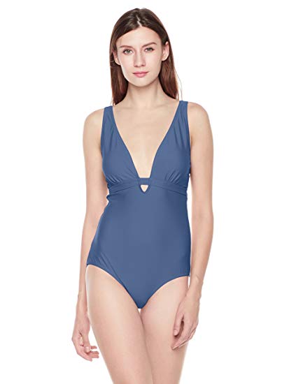 Plunge into fun in the sun with this one-piece swimsuit featuring a plunging neckline with a keyhole front. Adjustable straps for ease and a back closure to make getting in and out of this bathing suit easy.