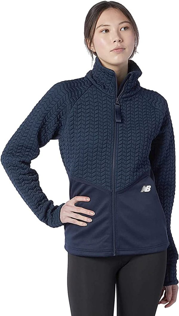 Stay warm and stylish with the New Balance NB Heatloft Athletic Jacket. Designed as a performance layer, this women’s jacket has NB HEAT technology to help keep you warm while wicking away moisture and offering a lightweight feel. The athletic fit is easy to move in and the hidden entry pockets keep valuables safe and secure. It’s finished with lofted quilting for texture and elevated style.