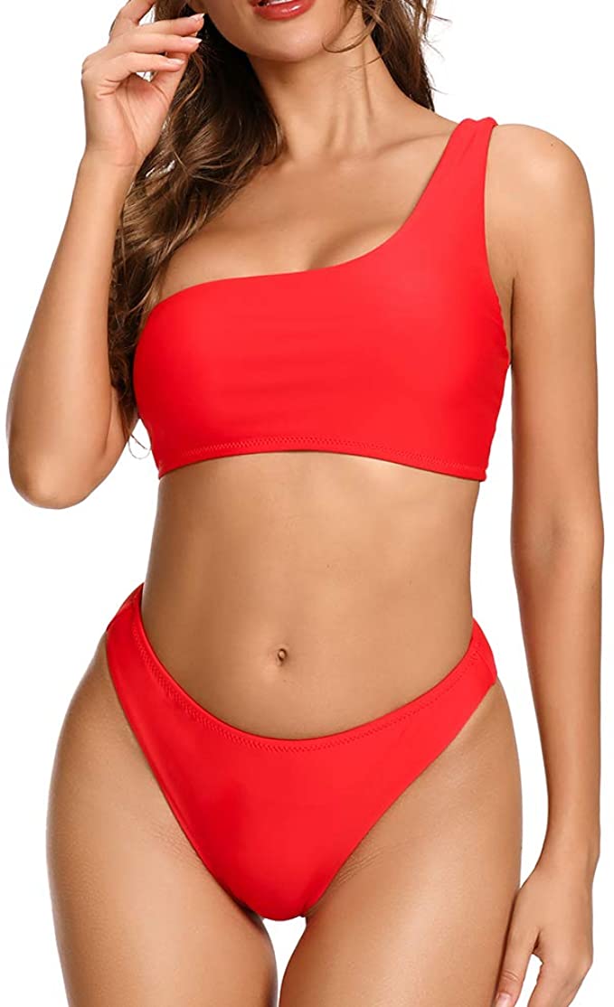 Dixperfect Women’s One Shoulder Crop Top Bikini Sets High Cut Bandeau Two Pieces Swimwear Bathing Suit