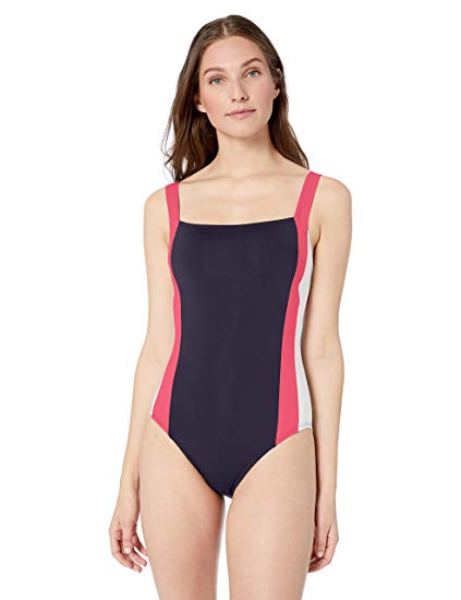 A clean, sporty colorblock one piece swim suit never goes out of style. This one piece has color blocking on the sides for a very flattering effect on the waist.