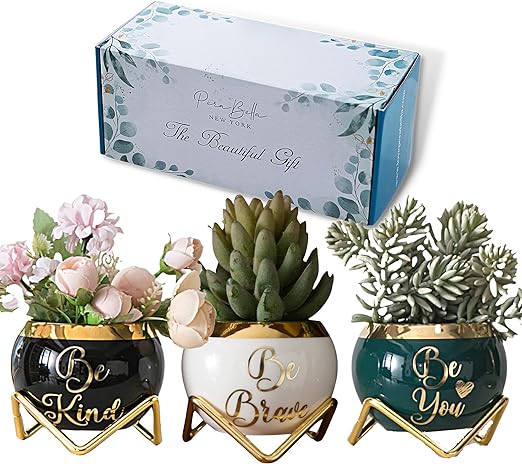 - BEAUTIFULLY PACKAGED GIFT SET: Our beautifully and safely packaged succulent pots gift set comes fully wrapped and the small pots for plants are safely set in foam to ensure they arrive in perfect condition. When the recipient opens the gift box, they will find the “Be Kind Be Brave Be You” succulent pots, creating a delightful unboxing experience. The gift does not need to be repackaged, making it convenient for you give it as gift for any plant lover or parents anniversary gifts for coworker.