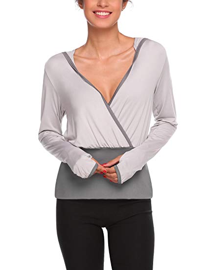 Contrast color patchwork wrap v neck long sleeve blouse hoodie, casual and fashion.