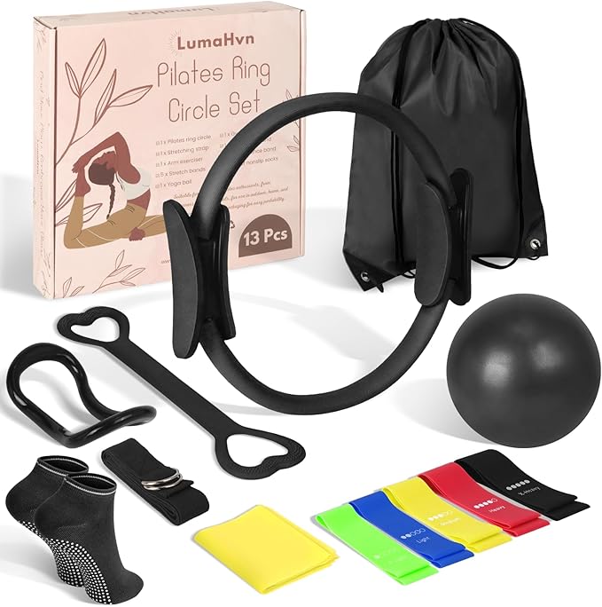 - Women pilates ring set: The 13-piece pilates ring and ball set is commonly used for yoga, pilates, stretching, fitness, and other training programs. The balls, magic circle ring, yoga straps, and stretchers can meet the different functions you need – providing resistance for various exercises. Easy to operate and add them to your daily routine. These exercise kits can be reused. I believe you will feel the effect after only one week.