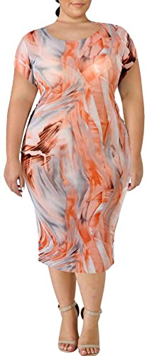 Plus Size Bodycon Dress Summer Short Sleeve Stretchy African Print Tie Dye Graffiti Midi Bodycon Pencil Oversized Curvy Out Size Plus Size Dresses Spring Fall Autumn Party Casual Orange 4X 26W 28W