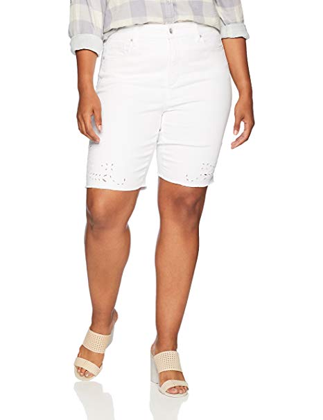 NYDJ Plus Size Chart Embrace the warm weather style in the NYDJ® Plus Size Briella Shorts w/ Eyelet Embroidery in Optic White. Five-pocket bermuda short has a high rise and cuffed hem. Lift Tuck® Technology lifts and shapes curves so you instantly appear one size smaller. Patented crisscross panel flattens the tummy. Optic White wash is presented on premium stretch cotton-poly denim. Belt loop waistband. Zipper fly and button closure. 100% polyester. Machine wash cold, flat dry.