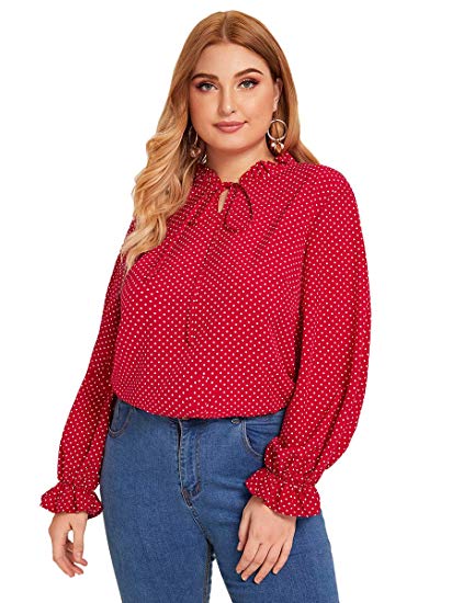 ROMWE Women’s Plus Size Casual Polka Dot Long Ruffle Trim Sleeve Belted Blouse Top
