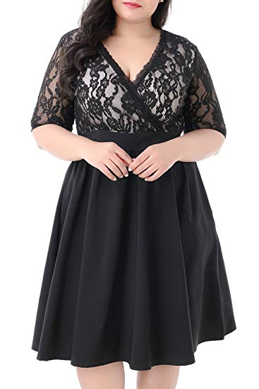 - Nemidor Women’s Half Sleeves Stretchy Deep V-neckline Lace Top Plus Size Cocktail Vintage Party A-line Swing Dress